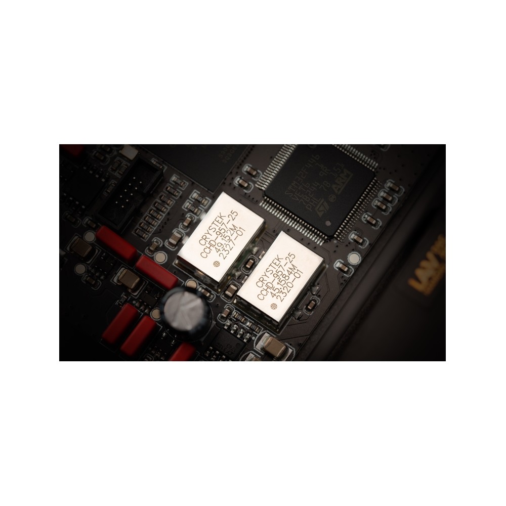 Il clock interno è affidato a un oscillatore Crystek CCHD-957, che garantisce un rumore di fase incredibilmente basso, pari a soli -100dBc/Hz.